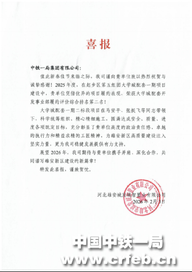 近日,河北雄安城發(fā)域智置業(yè)有限公司特發(fā)喜報(bào),對(duì)中鐵一局起步區(qū)第五組團(tuán)大學(xué)城配套一期二標(biāo)段項(xiàng)目在2025年度業(yè)主單位履約評(píng)價(jià)中獲得綜合排名第二名表示祝賀,對(duì)項(xiàng)目團(tuán)隊(duì)高效卓越的履約能力與精益求精的工匠精神給予肯定。