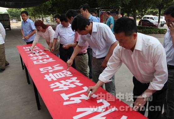 5月30日上午,中南鐵路通道項目經理部在山西長治舉行2014年安全生產月啟動儀式。圖為項目員工在橫幅上簽名