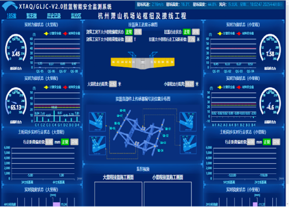 用好智能安全監控系統這一“安全防護網”。掛籃智能安全監控管理系統由數據監控系統與遠程數據后臺系統構成,構建起雙重安全防線。數據監控系統全天候緊盯掛籃錨固力、錨桿拉力等七個關鍵指標,一旦數據觸及預警值,立即觸發聲光報警并自動停止相關作業,規避安全風險。遠程數據后臺系統覆蓋PC端與移動端,管理人員通過云平臺即可實時掌握施工現場進度與安全狀況,實現“足不出戶控現場”。目前,該系統已成功取得如《基于物聯網的自動化安全監測系統》《基于物聯網的大跨度箱梁安全監測平臺》等軟件著作權,彰顯了其技術的自主創新性與行業認可度。