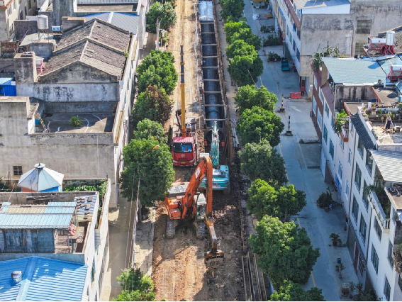 在項目技術團隊的不懈努力下成功攻克了三大核心挑戰:一是破解復雜地質難題。針對管槽基礎多為砂質粘土層,地質以黏土、砂質粘土及淤泥質土等易引發基坑涌水、邊坡失穩等問題,項目部推動工藝創新,采用鋼板樁支護結合振動沉樁技術,并通過改裝挖掘機實現一體化高效沉樁,快速構筑起安全穩定的基坑支護樁墻。二是實現管材科學選型。基于對不同區段地質條件與設計壓力的系統性評估,項目部在超高壓段落選用高強度的鋼管;而在需要適應地基變形且對耐腐蝕性要求較高的廣泛區段,則規模化應用了接口可靠、韌性優異的球墨鑄鐵管,從源頭上提升了管道網絡的適應性與耐久性。三是確保標準化施工落地。從精準的測量放樣、規范的溝槽開挖,到管材的精細化安裝與回填壓實,項目部將全流程作業納入標準化管理。在下管時對中線與高程的嚴格校準,球墨鑄鐵管承插接口的“清口、嵌圈、探尺驗證”標準化操作,以及回填作業嚴格的“分段、分層、分層檢測”閉環控制,所有環節均通過明確的流程與責任到人得以剛性執行。