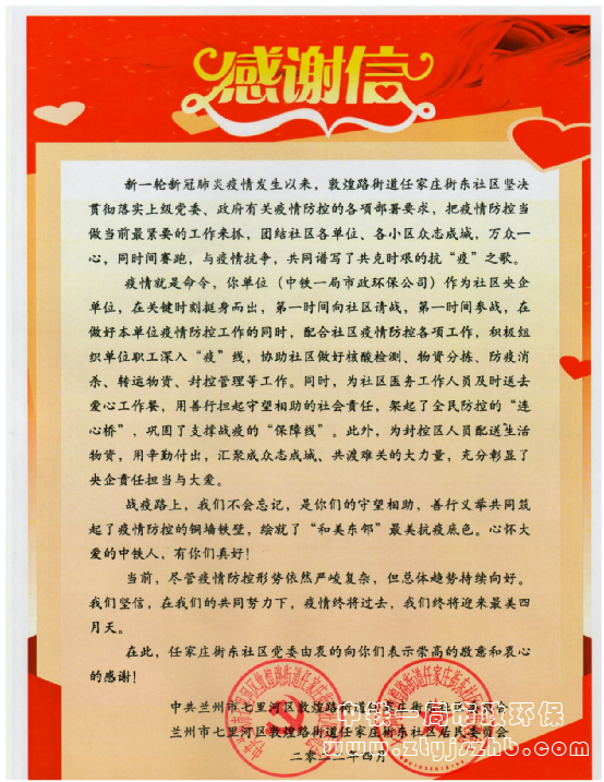 4月17日下午,蘭州市七里河區(qū)敦煌路街道任家莊街東社區(qū)工作人員給公司送來(lái)感謝信。信中對(duì)新一輪新冠肺炎疫情期間公司積極參加社區(qū)疫情防控工作,與社區(qū)群眾守望相助表示感謝。信中稱(chēng):公司積極組織職工深入“疫”線(xiàn),協(xié)助社區(qū)做好核酸檢測(cè)、物資分揀、防疫消殺、轉(zhuǎn)運(yùn)物資、封控管理等工作,充分彰顯了央企責(zé)任擔(dān)當(dāng)與大愛(ài)。任務(wù)終有成,情誼永不斷,社區(qū)工作人員表示:希望公司能夠一如既往地關(guān)心和支持社區(qū)的全面發(fā)展,密切溝通交流。