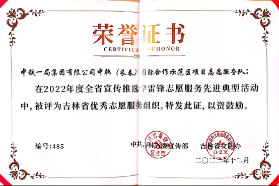 公司中韓(長(zhǎng)春)國(guó)際合作示范區(qū)項(xiàng)目志愿服務(wù)隊(duì)榮獲“吉林省優(yōu)秀志愿服務(wù)組織” 榮譽(yù)稱號(hào)