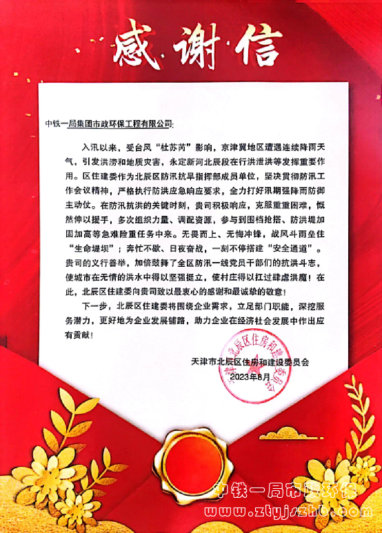 近日,天津市北辰區住房和建設委員會發來感謝信,信中對公司在“杜蘇芮”臺風期間克服重重困難,組織力量,調配資源,戰風斗雨壘住“生命堤壩”,一刻不停搭建“安全通道”的義行善舉,在抗洪搶險攻堅戰中展現出的社會責任與擔當表示感謝并致以誠摯敬意。