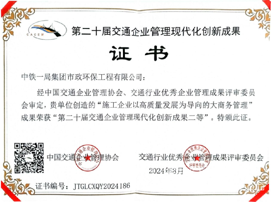 近日,第二十屆交通企業(yè)管理創(chuàng)新年會在河北省唐山市召開。公司提交的《施工企業(yè)以高質(zhì)量發(fā)展為導(dǎo)向的大商務(wù)管理》成果從管理理念、機(jī)制、方式方法、規(guī)章制度等方面出發(fā),以科學(xué)的方式、獨(dú)到的舉措全面闡釋公司近年來在落實(shí)大商務(wù)管理方面的系統(tǒng)性思考,榮獲“第二十屆交通企業(yè)管理現(xiàn)代化創(chuàng)新二等成果”榮譽(yù)稱號。