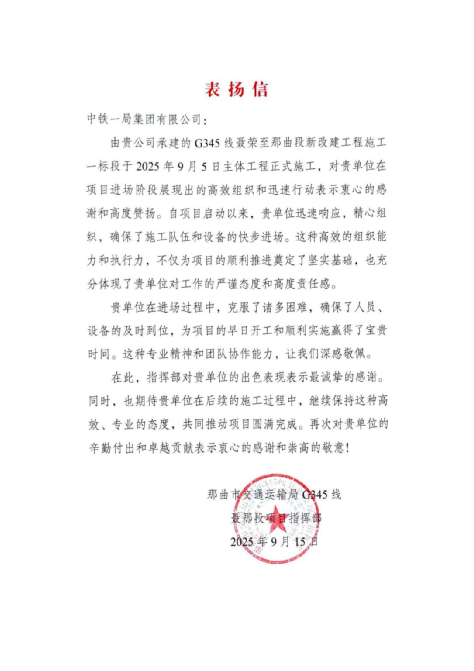近日,那曲市交通運輸局G345線聶那段項目指揮部發(fā)來表揚信,對中鐵一局在G345國道聶榮至那曲段改建工程項目中的卓越表現(xiàn)予以肯定,表揚公司在項目進場階段高效組織、迅速行動,確保了施工隊伍和設(shè)備的快步進場,為項目的順利推進奠定了堅實基礎(chǔ)。