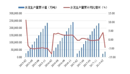 2018年1季度水泥產(chǎn)量大幅下降,1-3月份,水泥產(chǎn)量為3.76億噸,同比去年同期下降了14.7%。