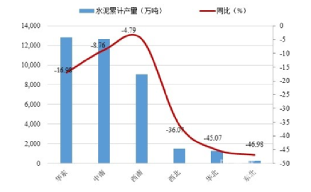 全國六大區(qū)域中水泥累計產(chǎn)量均同比下滑,東北、華北和西北地區(qū)水泥產(chǎn)量急劇下滑,其中東北和華北地區(qū)自2017年起增速就持續(xù)下滑,西北地區(qū)自2017年6月份增速轉(zhuǎn)正為負后一路下滑。西南地區(qū)從2017年下半年開始下滑,華東和中南地區(qū)從2017年底開始下滑。